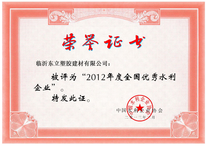 2012年度全國優(yōu)秀水利企業(yè)證